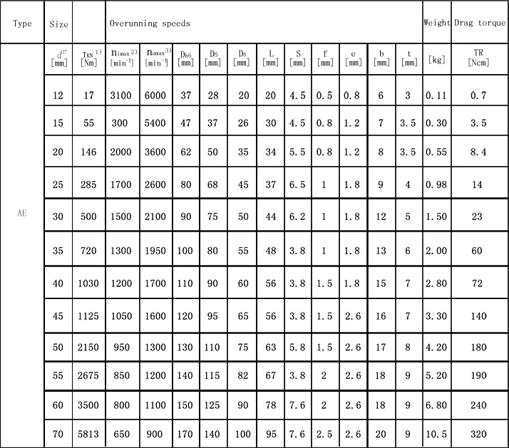 AE系列是沒行軸承支撐的滾柱型單問離合器。使用時(shí)需要有軸承來承受徑向及軸向載荷,并且要存潤(rùn)滑及密封。